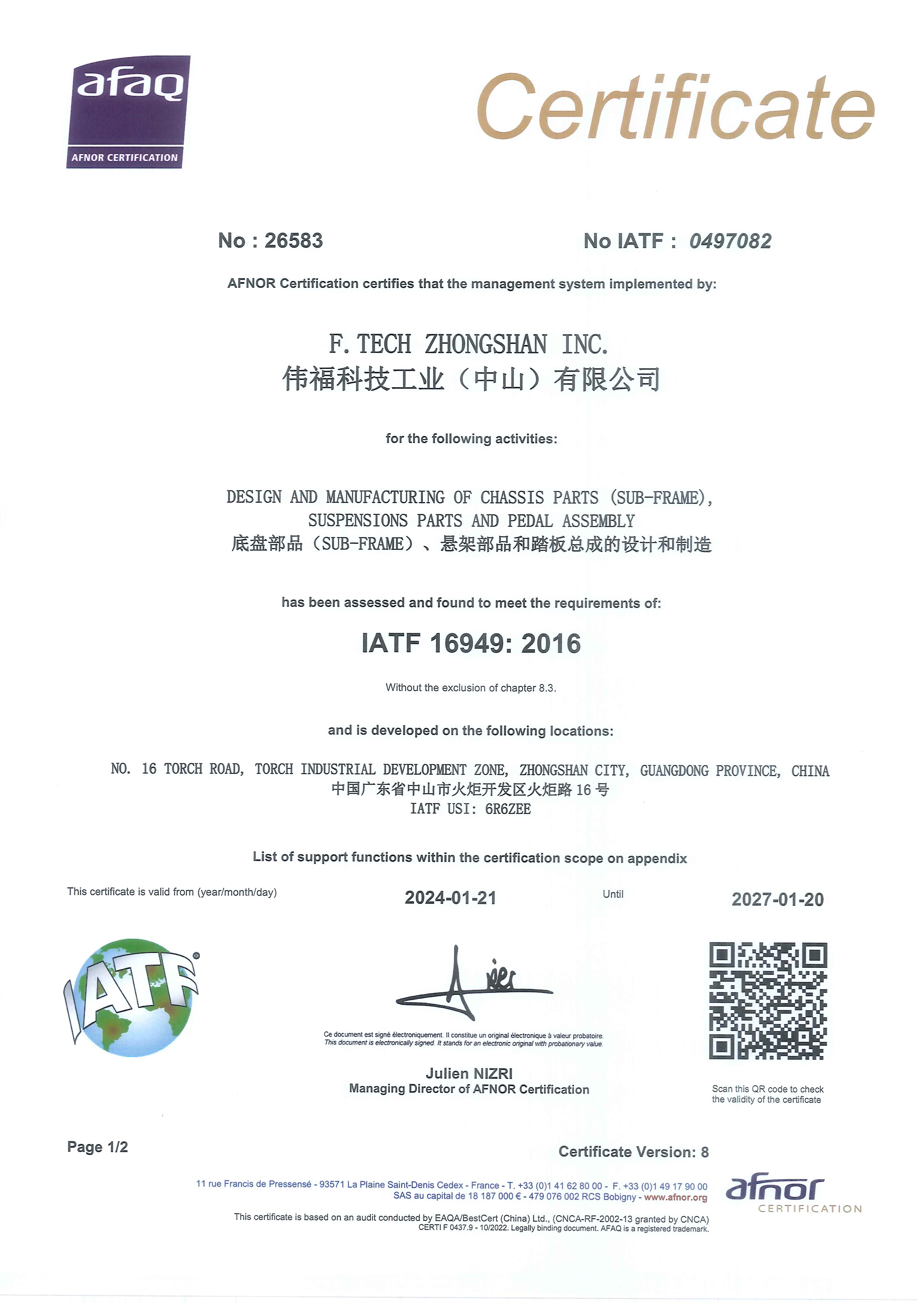 我公司本着以优质产品创造高新 价值的经营方针,优先满足客户的需要,并于2006年4月份取得了法国贝尔国际验证机构(AFAQ/BestCERT,Ltd.) IATF16949&ISO9001认证。我们通过充实IATF16949的品质管理体系,不断地排除不合理的因素,防患于未然。以实现我公司不断提 升的品质目标。